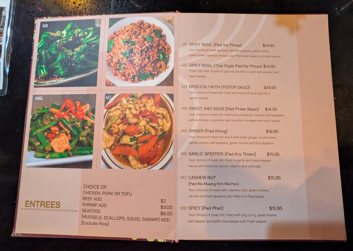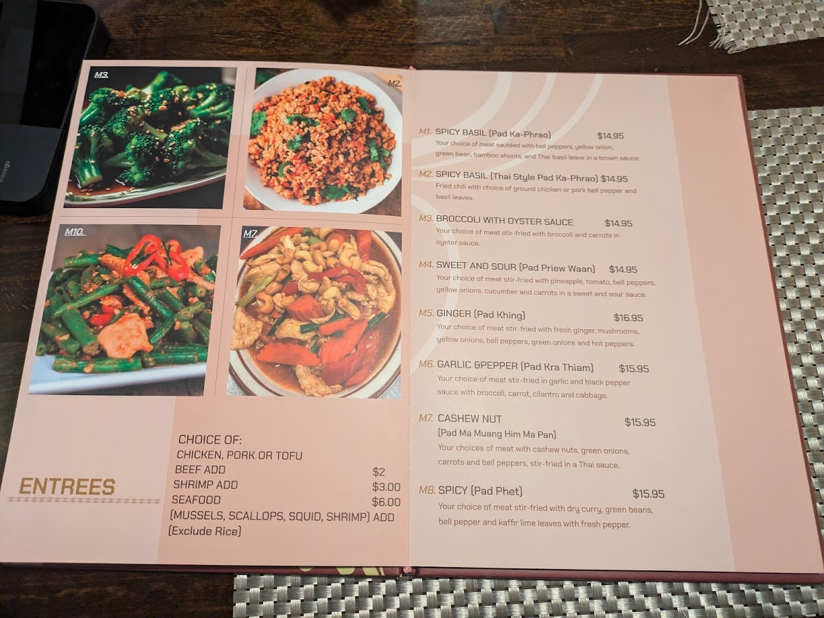 Pad ka-phrao. Can be prepared spicy, medium, or mild. Your choice of meat sautéed with green and red peppers, yellow onion, green beans, Thai basil, and bamboo shoots in a brown sauce.
